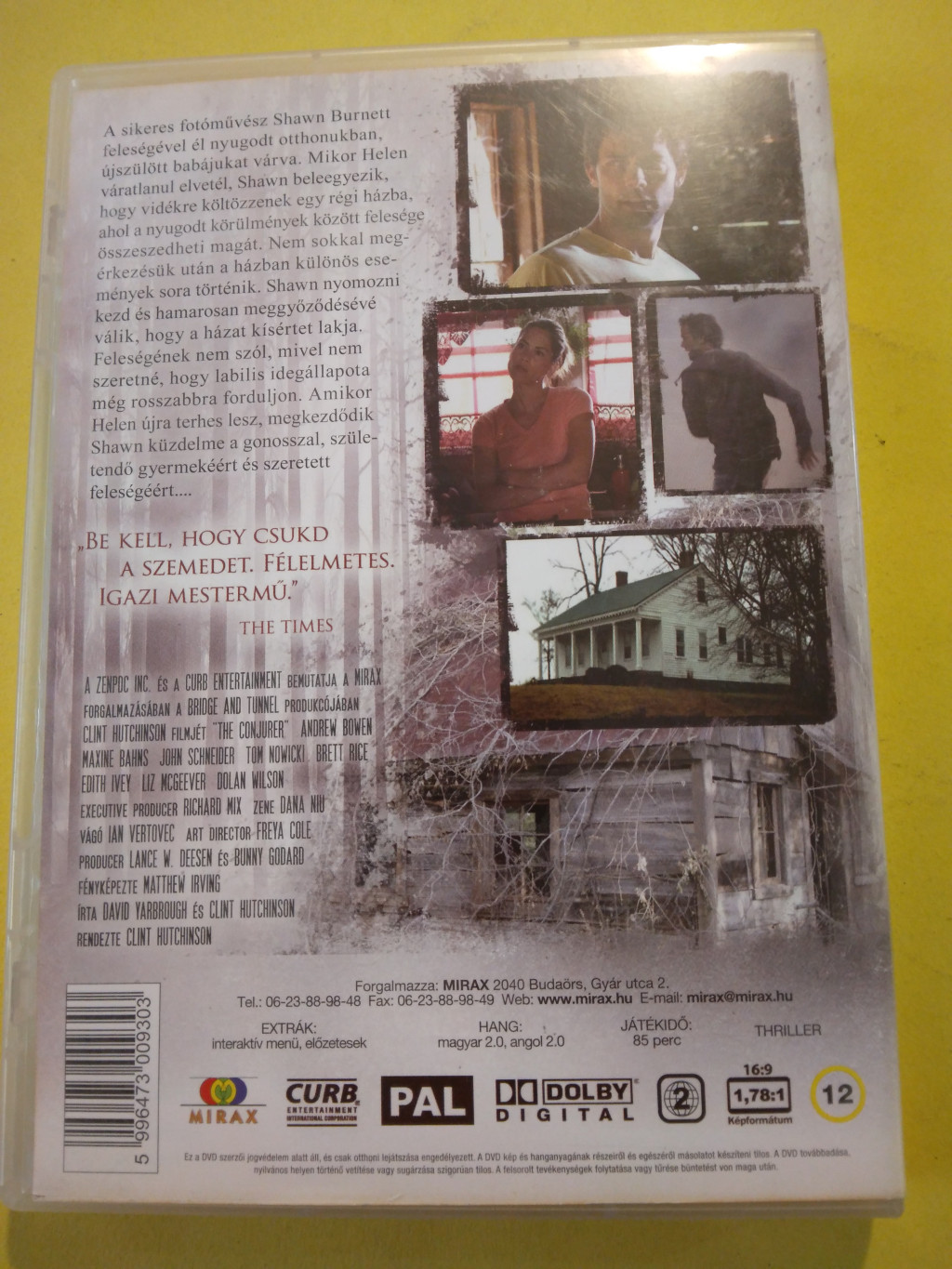 | Rövid leírás a termékről | Az idéző (Conjurer, 2008) Amikor a fotós Shawn Burnett és felesége vidékre, egy új házba költöznek gyermekük halála után, céljuk, hogy túllépjenek a tragédián. A házban azonban különös, gonosz dolgok történnek, amit Shawn szeretne eltitkolni felesége elől, hogy lelki felépülését ezzel se zavarhassa. Az asszony pedig újra terhes lesz... Nemzet: amerikai Stílus: horror Hossz: 100 perc |